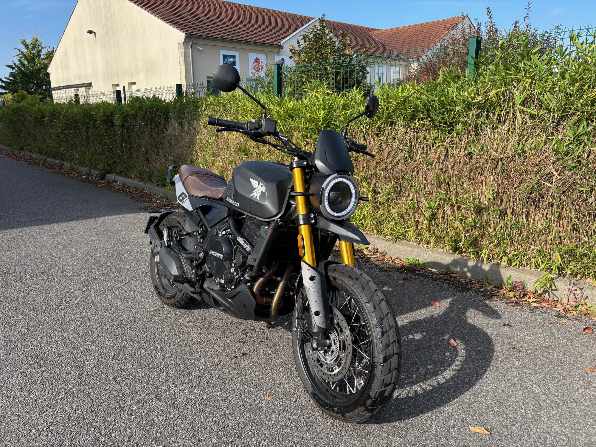 Un style assumé et définitivement hipster . Les détenteurs du permis A1 et B seront heureux de trouver des roues à rayons avec des jantes dorées, et des pneus Metzeler Karoo à gros pavés.